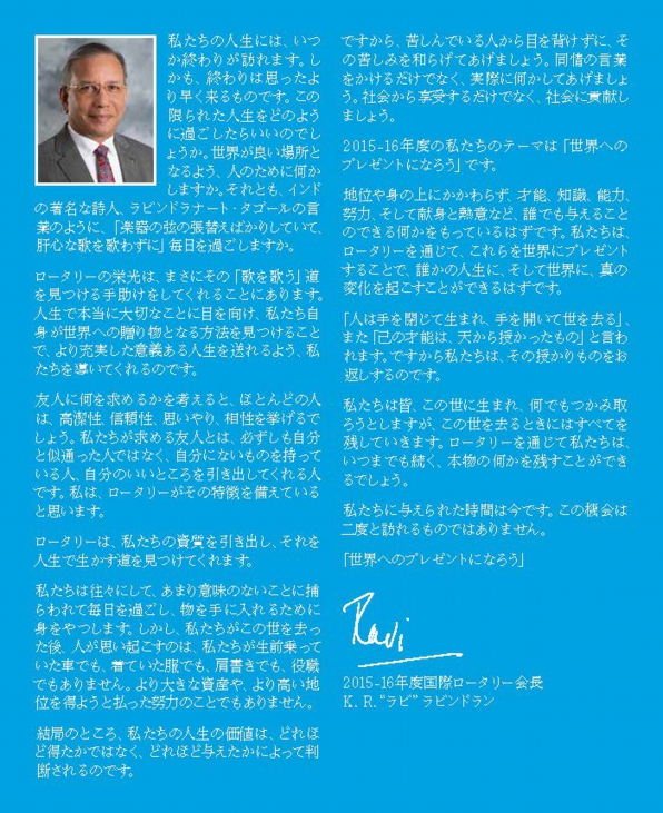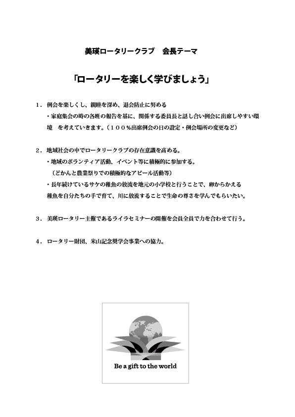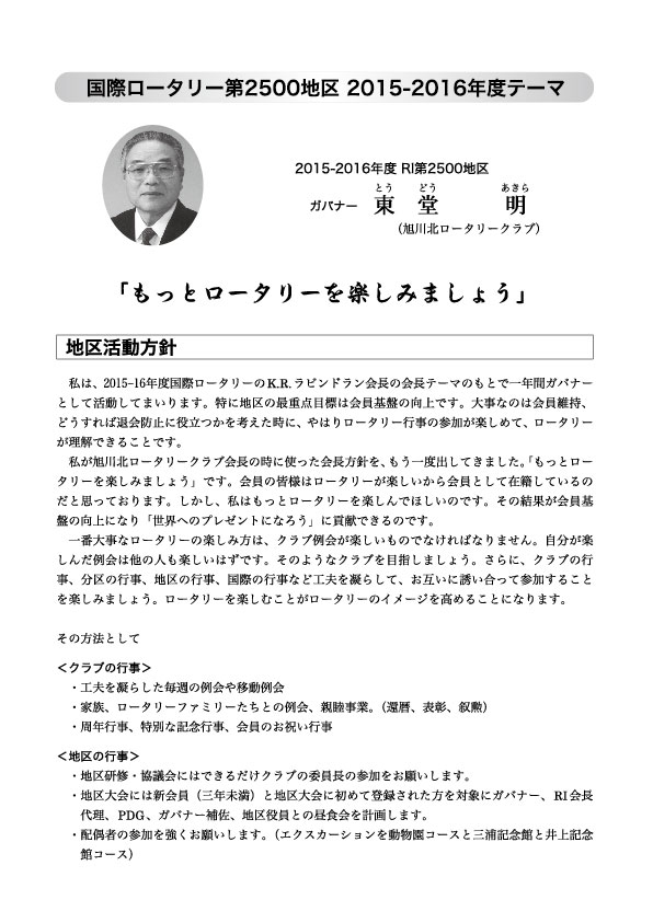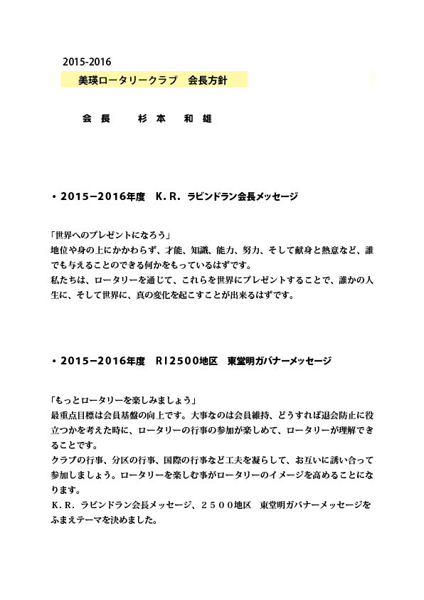★会長方針 2025-26 ★会長方針 2024-25 ★会長方針 2023-24 ★会長方針 2022-23 ★会長方針 2021-22 ★会長方針 2020-21 ★会長方針 2019-20 ★会長方針 2018-19 ★会長方針 2017-18 ★会長方針 2016-17 ★会長方針 2015-16 美瑛ロータリークラブ 2015-2016年度 会 長 杉 本 和 雄 会長方針 ページトップへ