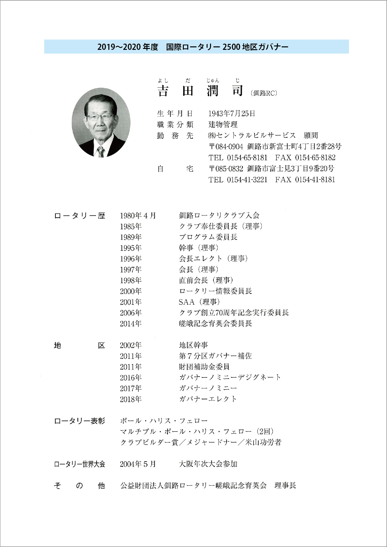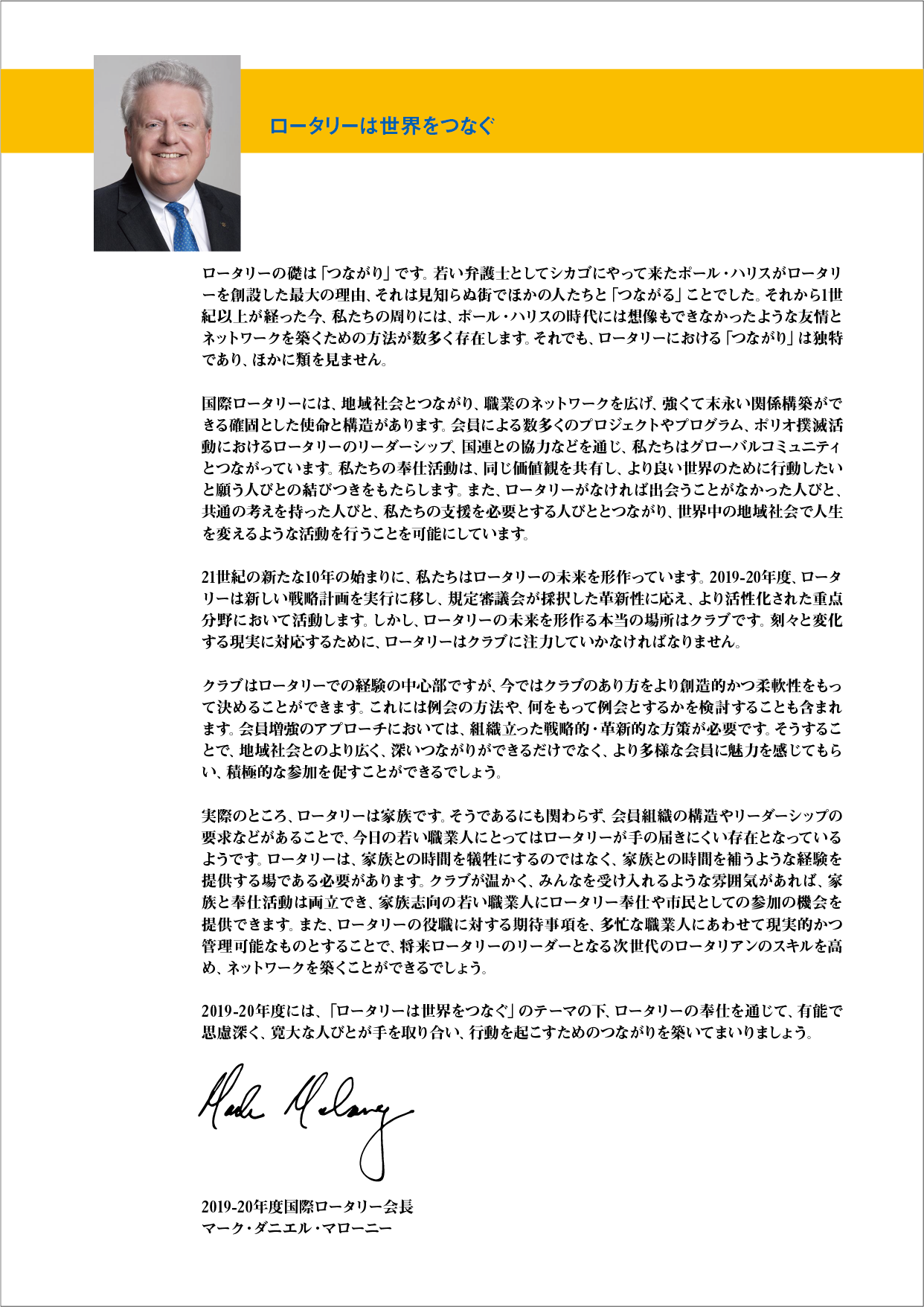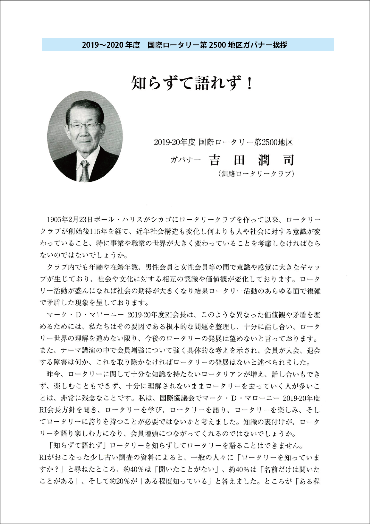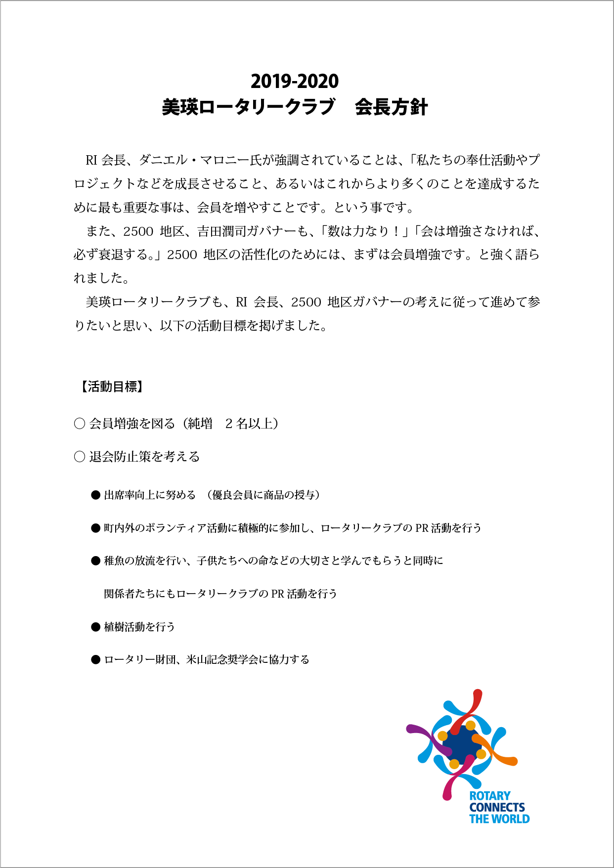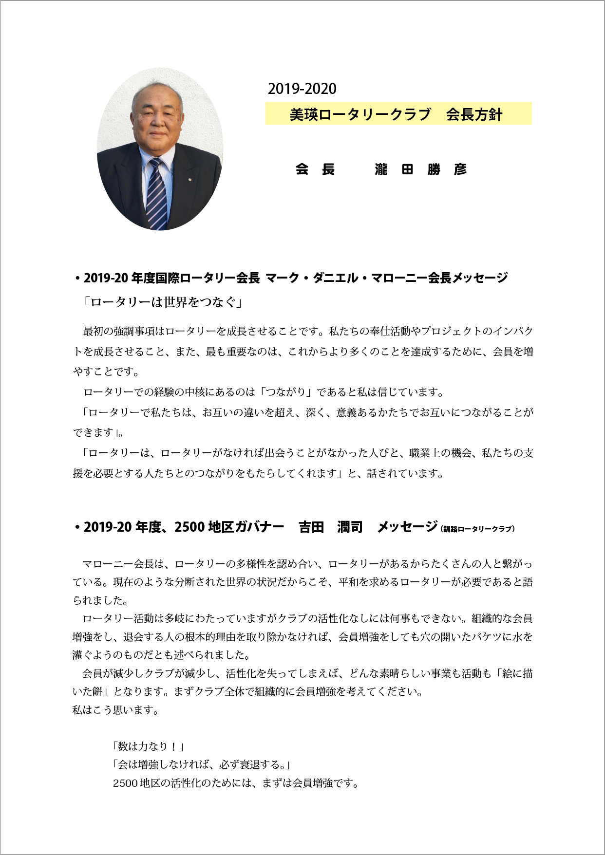過去の会長方針 ★会長方針 2025-26 ★会長方針 2024-25 ★会長方針 2023-24 ★会長方針 2022-23 ★会長方針 2021-22 ★会長方針 2020-21 ★会長方針 2019-20 ★会長方針 2018-19 ★会長方針 2017-18 ★会長方針 2016-17 ★会長方針 2015-16 美瑛ロータリークラブ 2019-20年度 会 長 瀧 田 勝 彦 会長方針 ページトップへ