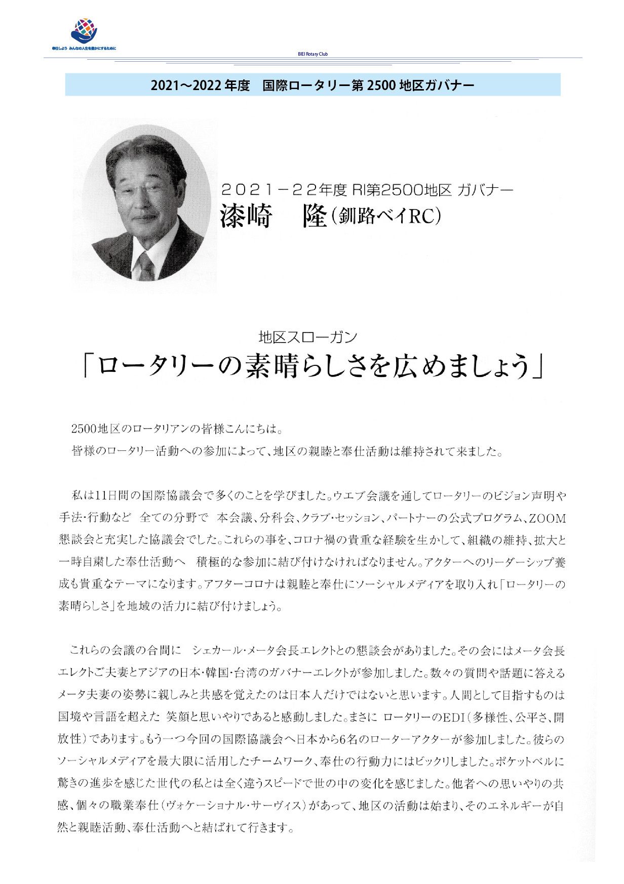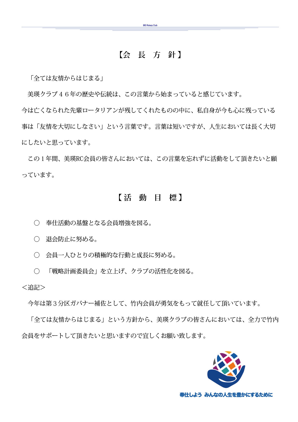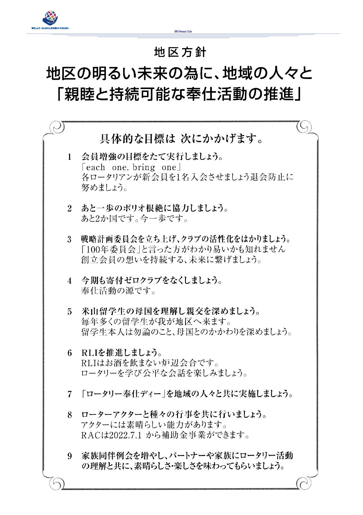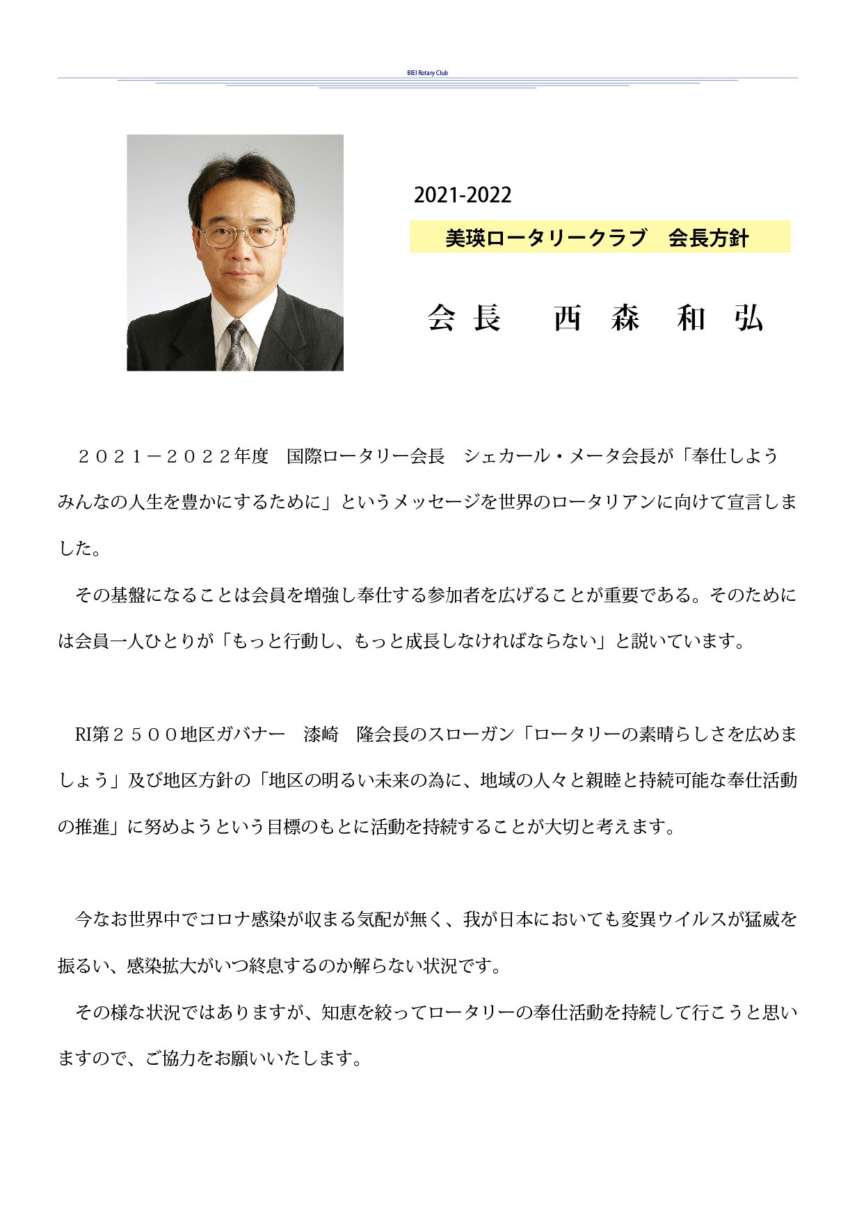 過去の会長方針 ★会長方針 2025-26 ★会長方針 2024-25 ★会長方針 2023-24 ★会長方針 2022-23 ★会長方針 2021-22 ★会長方針 2020-21 ★会長方針 2019-20 ★会長方針 2018-19 ★会長方針 2017-18 ★会長方針 2016-17 ★会長方針 2015-16 美瑛ロータリークラブ 2021-22年度 会 長 西 森 和 弘 会長方針 ページトップへ