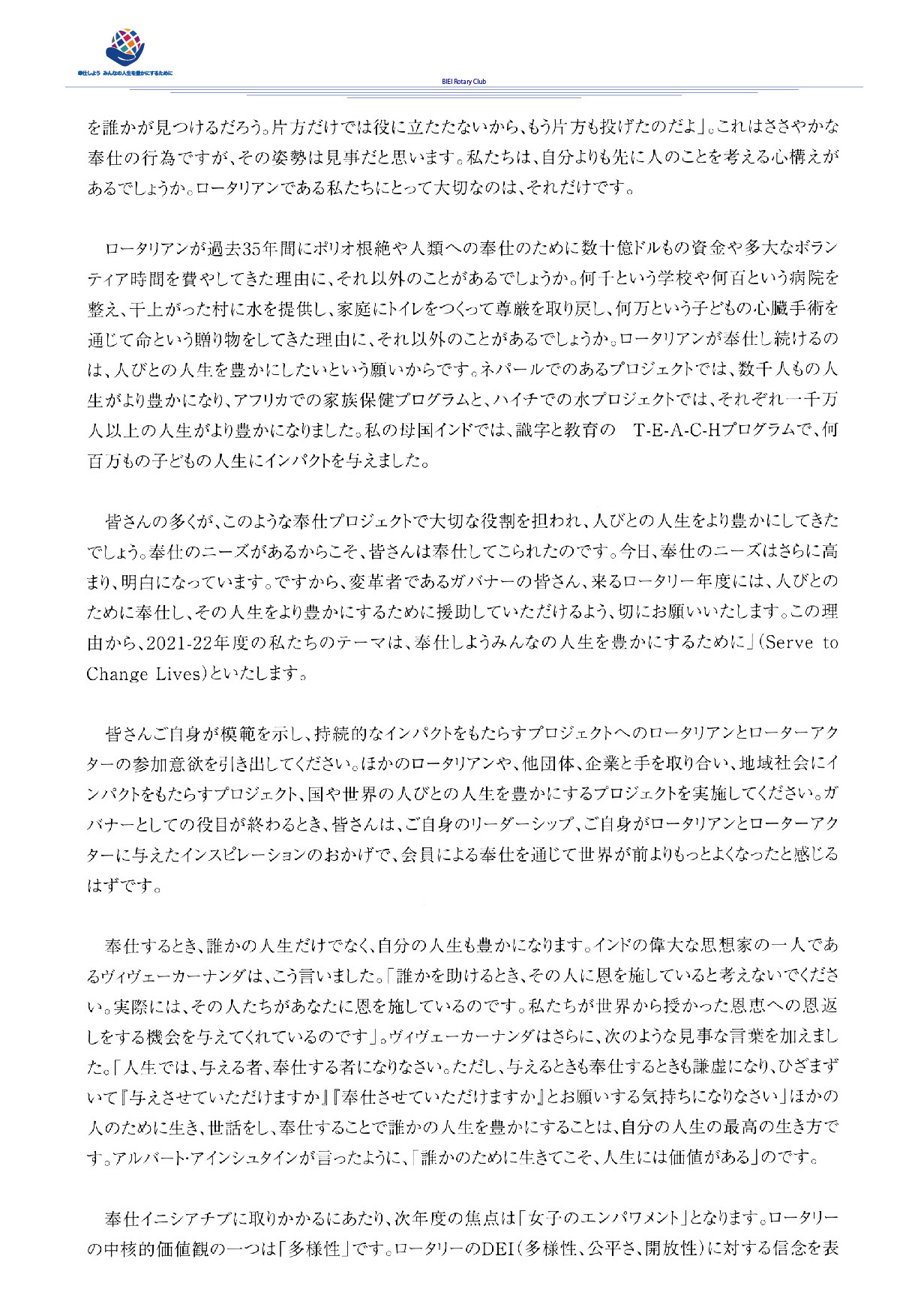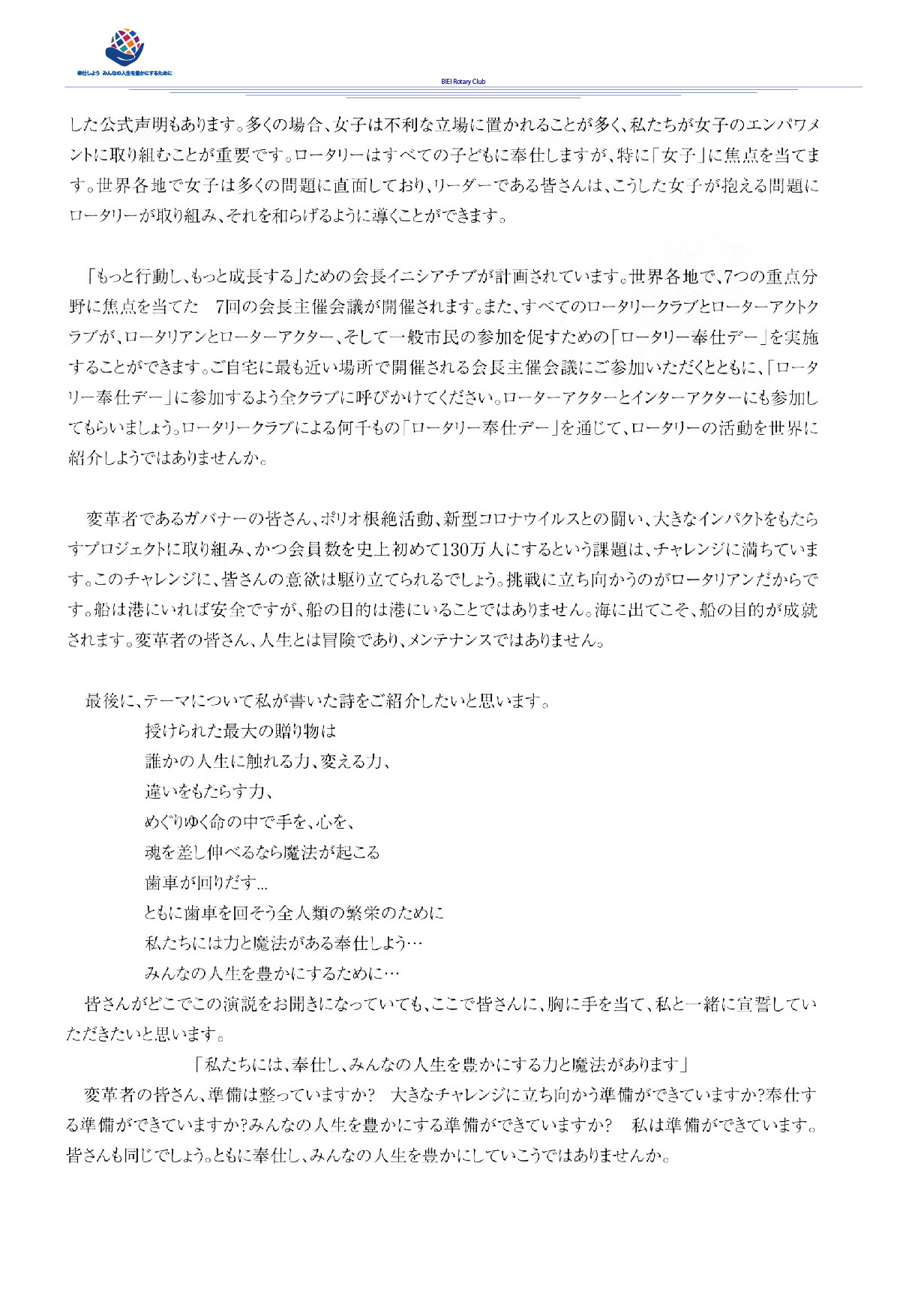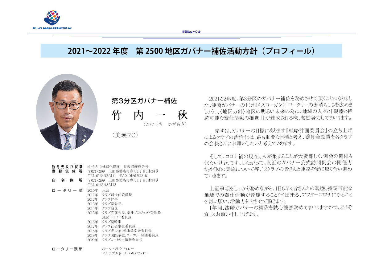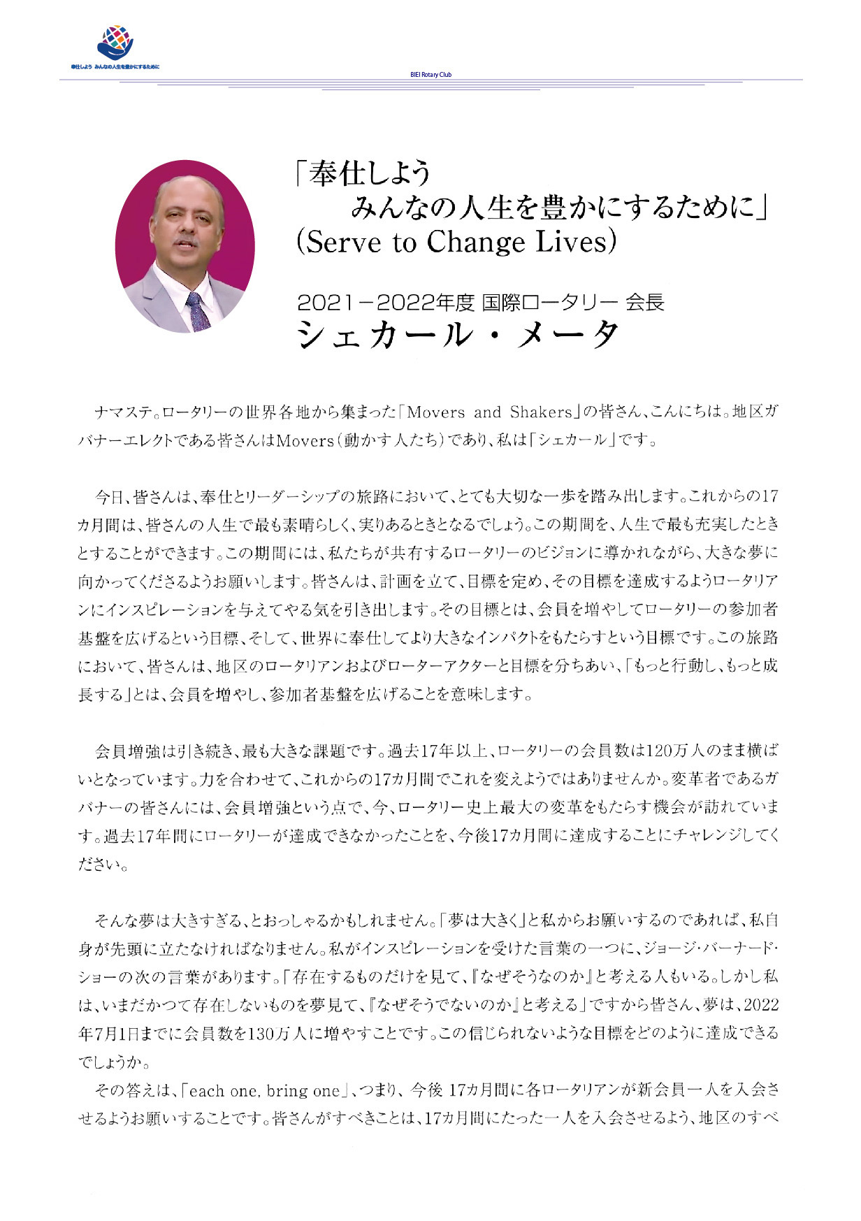 過去の会長方針 ★会長方針 2025-26 ★会長方針 2024-25 ★会長方針 2023-24 ★会長方針 2022-23 ★会長方針 2021-22 ★会長方針 2020-21 ★会長方針 2019-20 ★会長方針 2018-19 ★会長方針 2017-18 ★会長方針 2016-17 ★会長方針 2015-16 美瑛ロータリークラブ 2021-22年度 会 長 西 森 和 弘 会長方針 ページトップへ