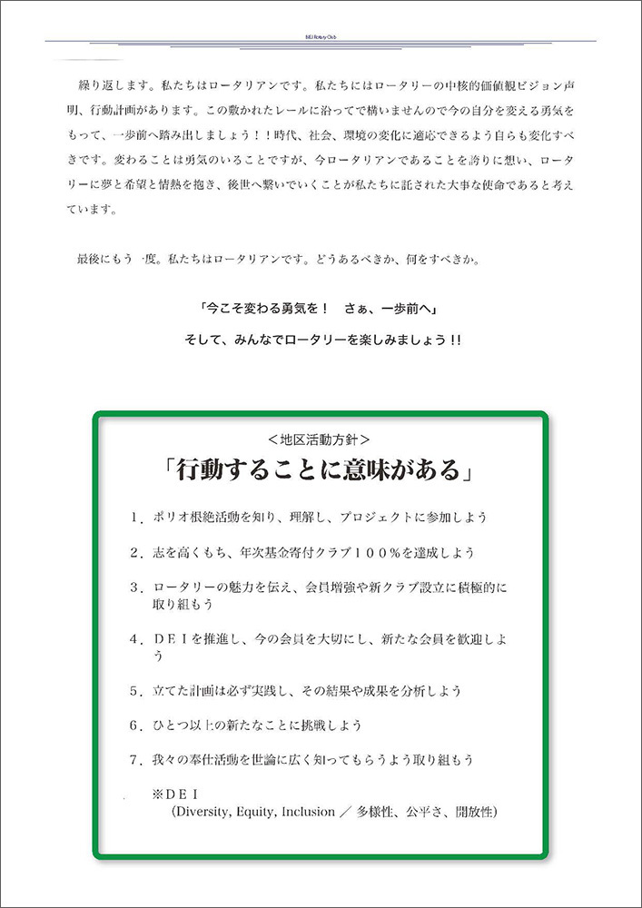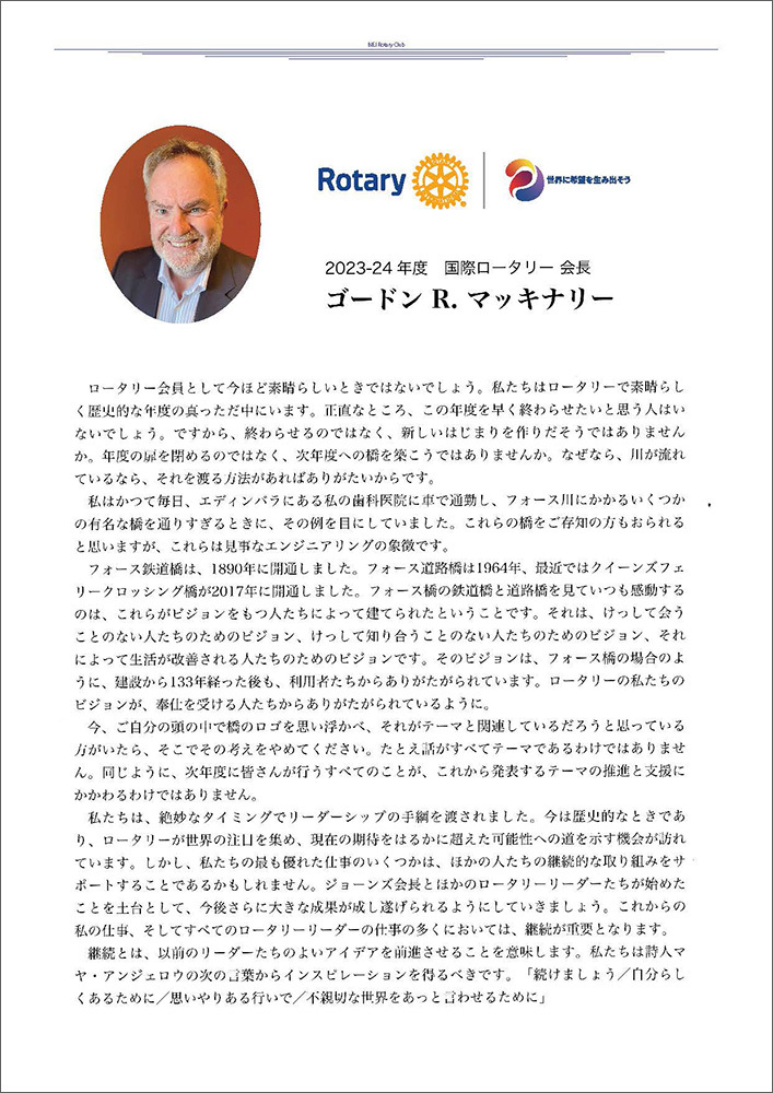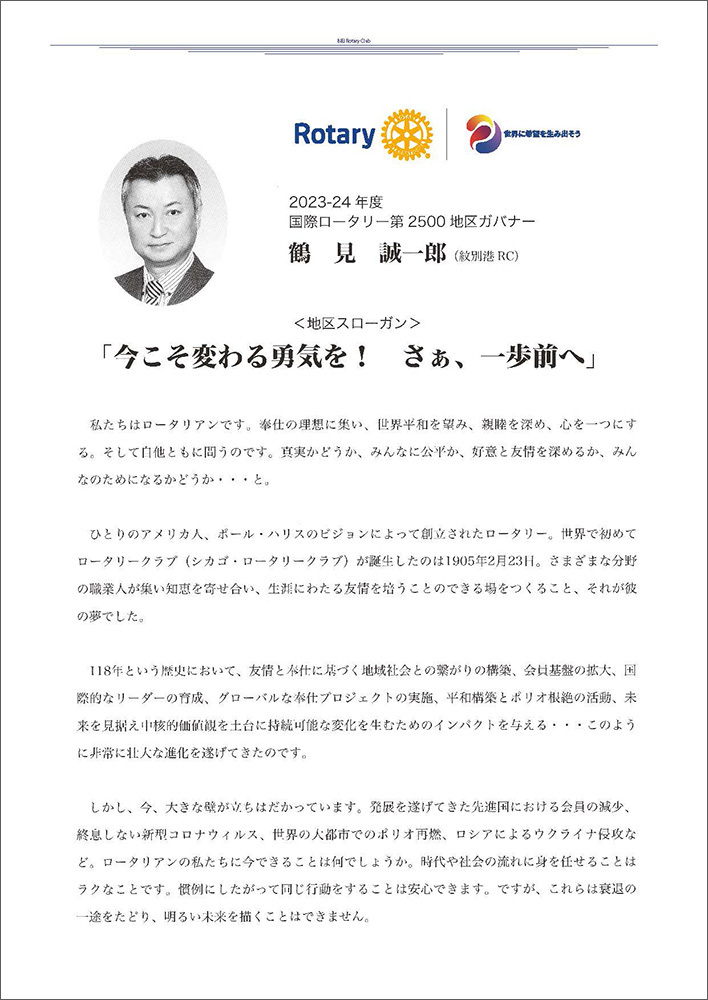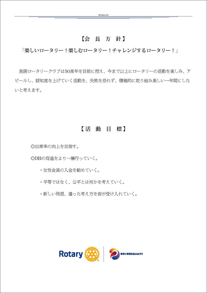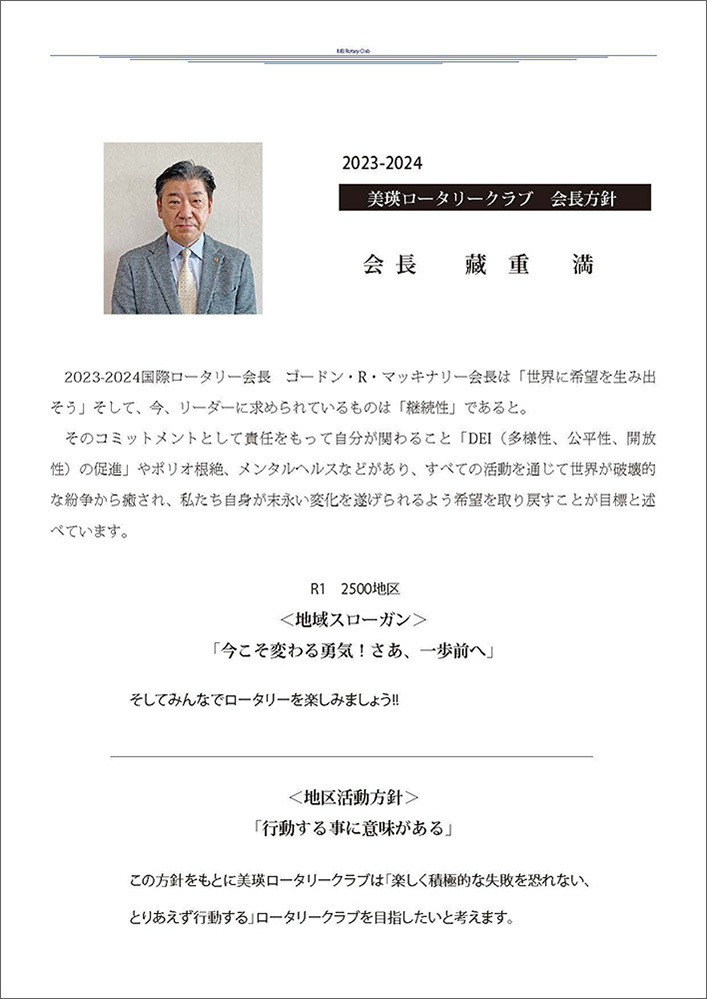 過去の会長方針 ★会長方針 2025-26 ★会長方針 2024-25 ★会長方針 2023-24 ★会長方針 2022-23 ★会長方針 2021-22 ★会長方針 2020-21 ★会長方針 2019-20 ★会長方針 2018-19 ★会長方針 2017-18 ★会長方針 2016-17 ★会長方針 2015-16 美瑛ロータリークラブ 2023-24年度 会 長 蔵 重 満 ページトップへ