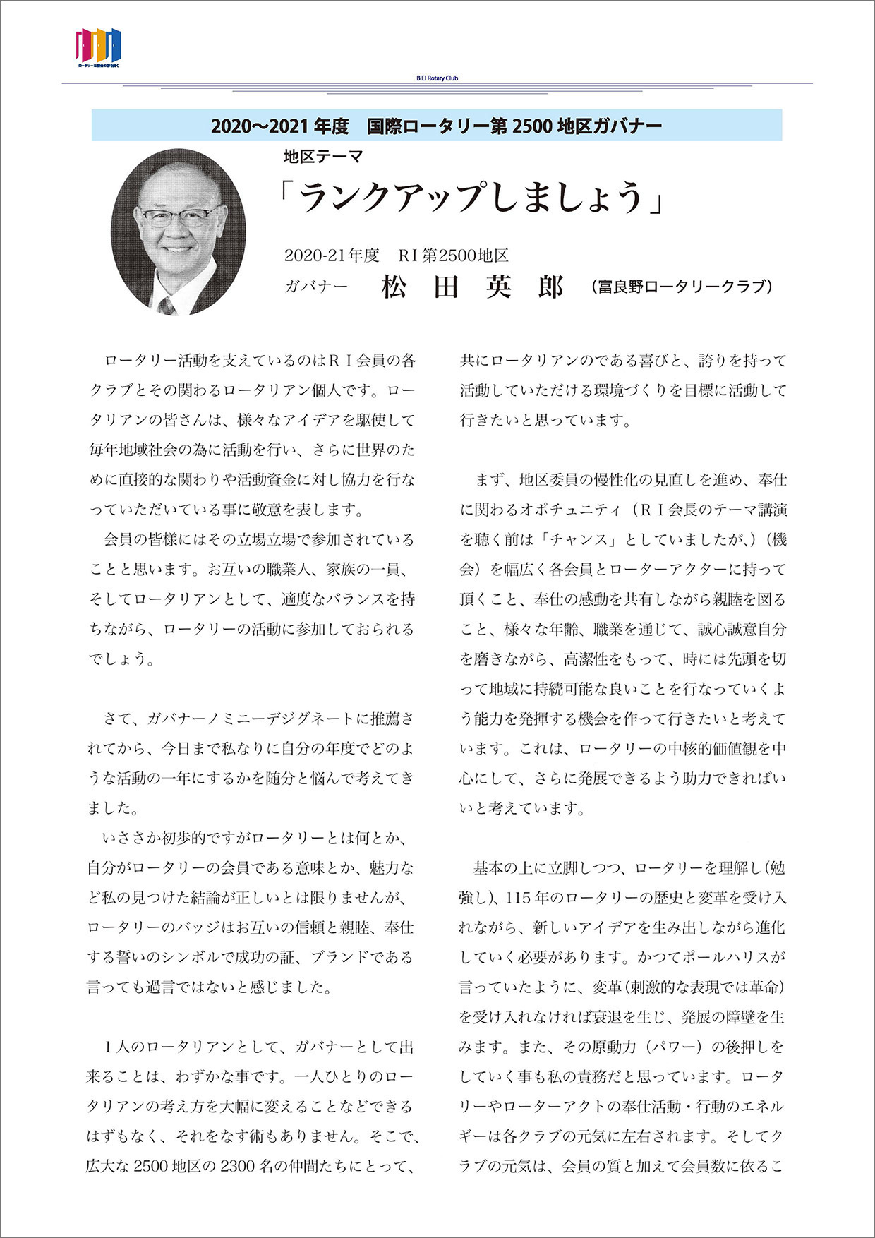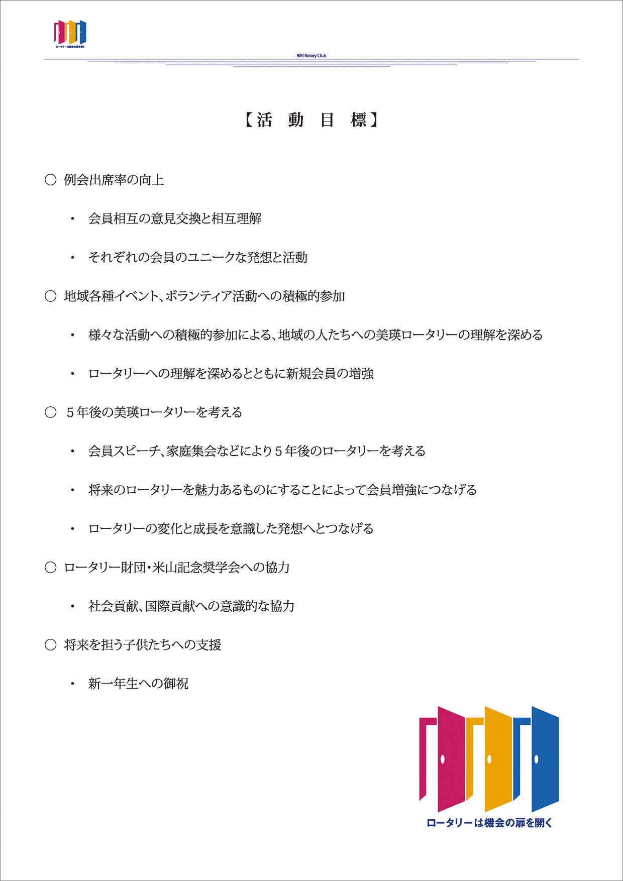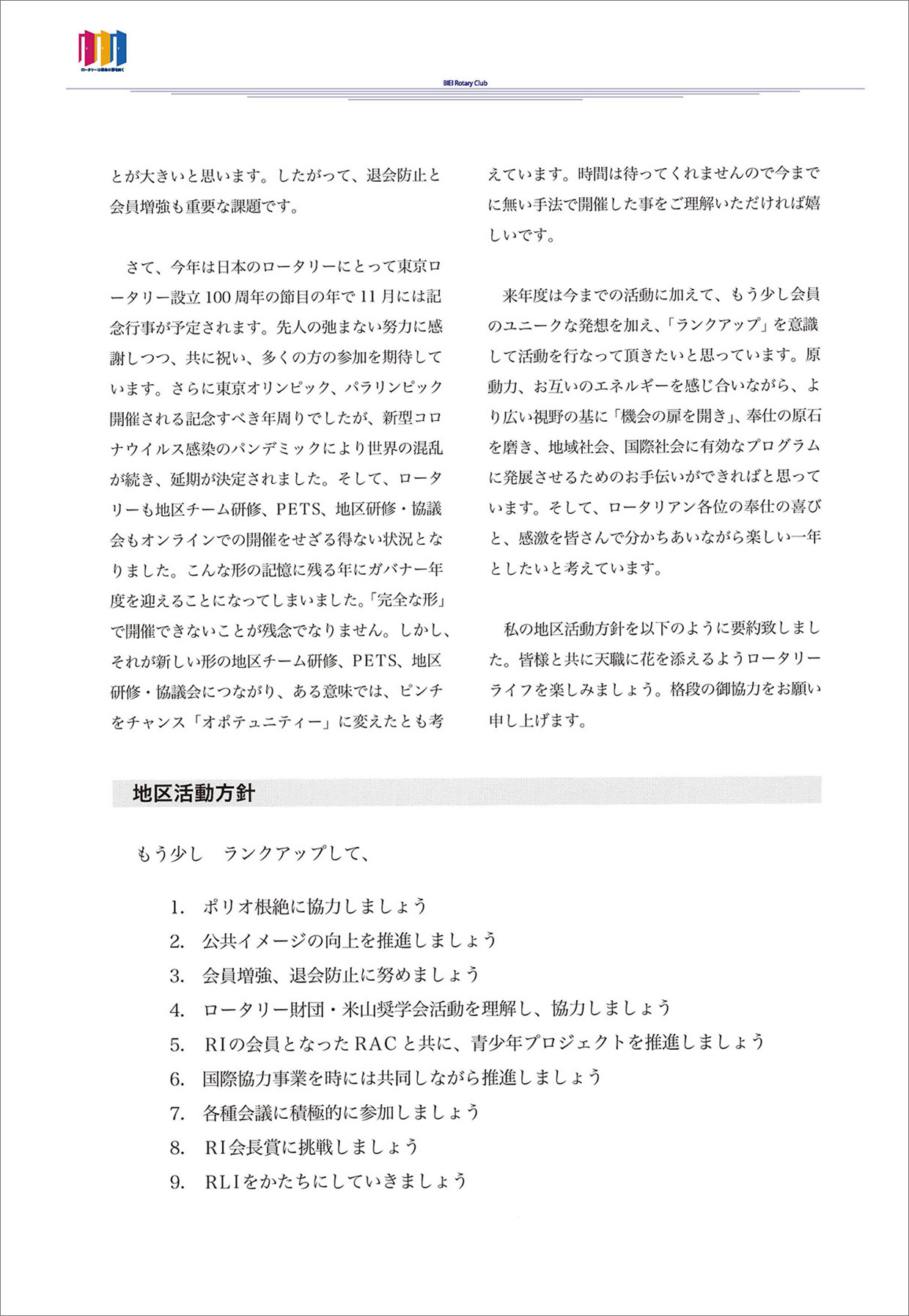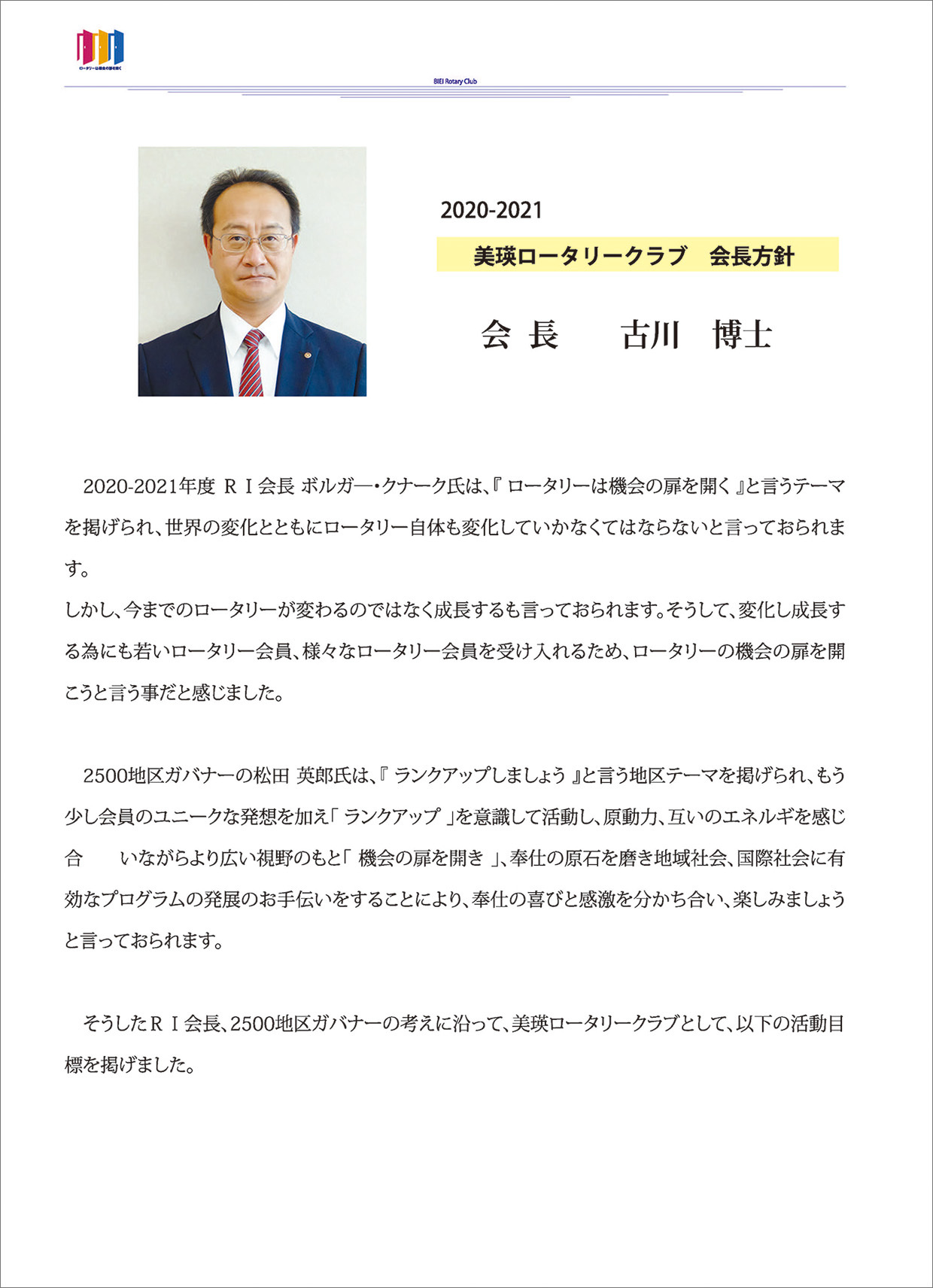 過去の会長方針 ★会長方針 2025-26 ★会長方針 2024-25 ★会長方針 2023-24 ★会長方針 2022-23 ★会長方針 2021-22 ★会長方針 2020-21 ★会長方針 2019-20 ★会長方針 2018-19 ★会長方針 2017-18 ★会長方針 2016-17 ★会長方針 2015-16 美瑛ロータリークラブ 2020-21年度 会 長 古 川 博 士 会長方針 ページトップへ