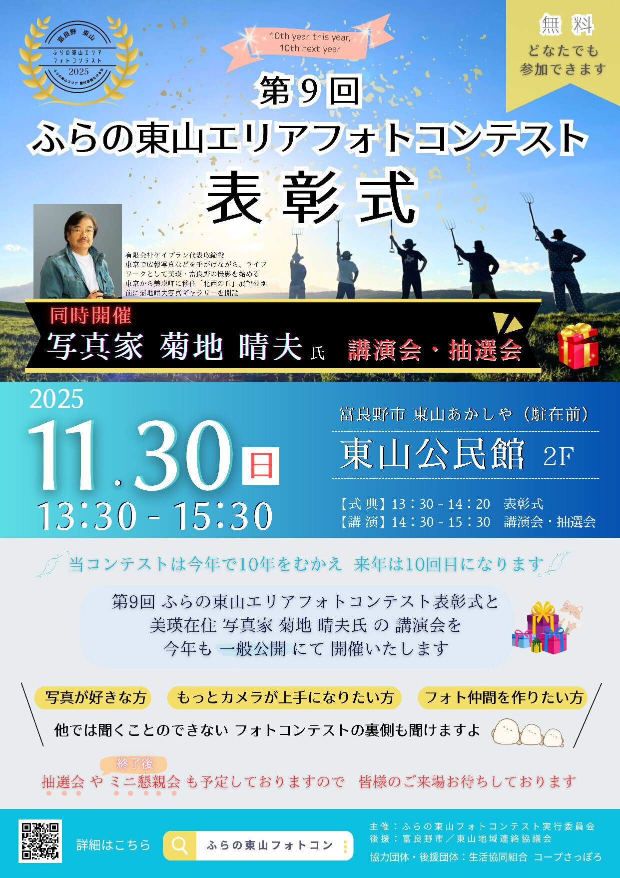 2025年グランプリ・準グランプリ発表 ふらの東山エリアフォトコンテスト2025 受賞者はこちら 第9回 ふらの東山エリアフォトコンテスト表彰式、終了しました。参加された受賞者の皆様、おめでとうございました。 豪華景品争奪じゃんけん大会など、盛り上がりました。 Facebookアカウントをお持ちの方はこちら FBページへ ,facebook,,{"facebookPageUrl":"https://www.facebook.com/furanohigashiyama.photocon","boxHeight":"550","boxWidth":"100","dispFace":true,"dispUpdate":true,"dispHeader":true,"wUnit":"%","hUnit":"px"} ページトップへ