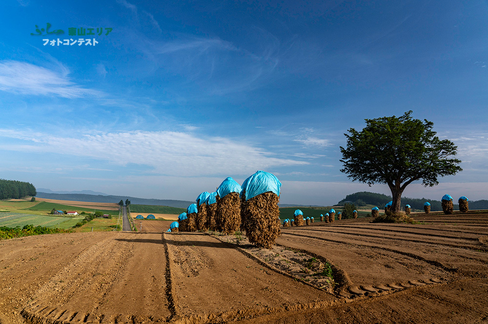 その周りには積み上がった棒積みが転々と配置されています。Hファームさんの畑は棒積みが終わると、畑を綺麗に整地されます。丘の上に立つご神木と、その整地模様を大きく取り入れて、画面に動きを付けたのも良かったと思います。