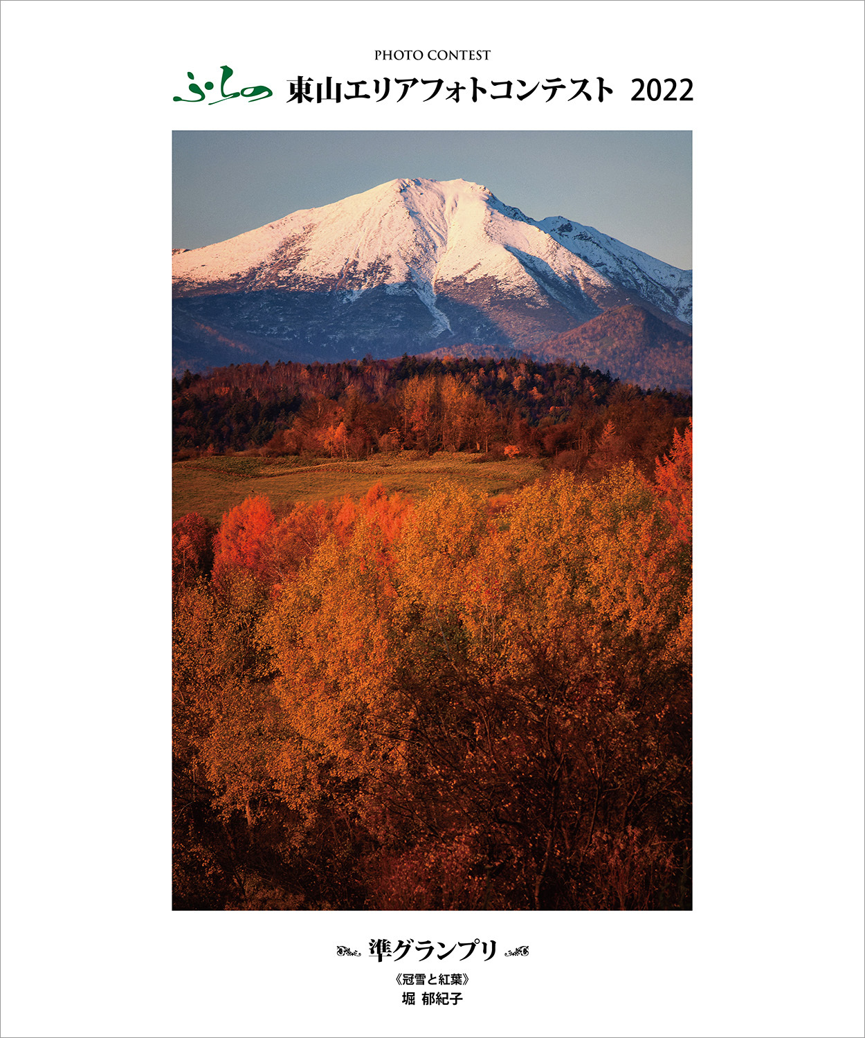 準グランプリ作品、堀 郁紀子さんの「冠雪と紅葉」は、文字通り冠雪した富良野岳と紅葉したカラマツ林や樹林を捉えています。