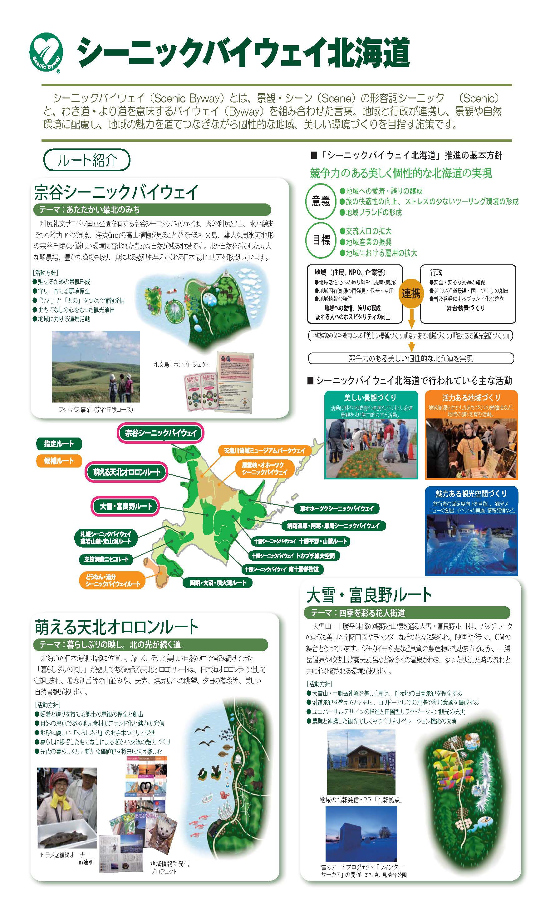 ・ルートの景観向上を目指した「花」の取り組み:広域的な「花街道」づくり、羊と雲の丘、コスモスロード、そばの花鑑賞スポットの整備、ひまわり植栽、花観光の推進 等
